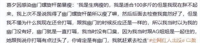 视频中的她穿着白色的吊带,身材真是不要太好,头发还是挑染的,化着精致的妆容,看上去状态很不错, 不太像是生病的样子,但担心的事还是发生了,她讲述着自己身患幽门螺旋杆菌的经历,原来是这种病让她瘦下来的,
